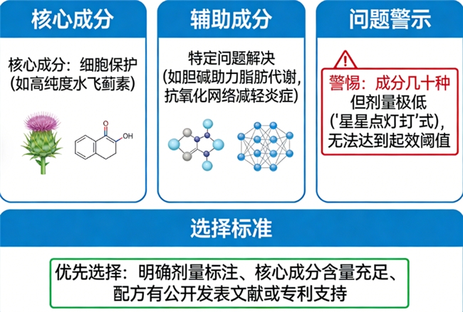 不一定。配方的优劣在于“协同”而非“堆砌”。一个好的配方应有清晰的逻辑主线,例如:核心成分负责细胞保护(如高纯度水飞蓟素),辅助成分针对特定问题(如胆碱助力脂肪代谢,抗氧化网络减轻炎症)。应警惕那些成分列出几十种但每种剂量都极低(“星星点灯”式)的产品,它们可能无法达到起效阈值。优先选择有明确剂量标注、核心成分含量充足、配方有公开发表文献或专利支持的产品。