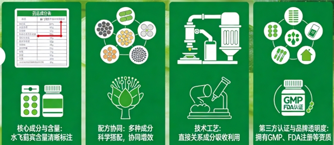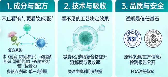 答: 把握好几个关键点或许能让选择变得更简单。一看核心成分与含量,比如水飞蓟宾的含量是否清晰标注;二看配方协同,好的配方不是单一成分堆砌,而是多种成分科学搭配,协同增效;三看技术工艺,这直接关系到成分能否被有效吸收利用;四看第三方认证与品牌透明度,如是否拥有GMP、FDA注册等资质。