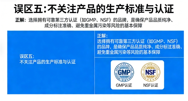 正解: 选择拥有可靠第三方认证(如GMP、NSF)的品牌,是确保产品品质纯净、成分标注准确、避免重金属污染等风险的基本保障。