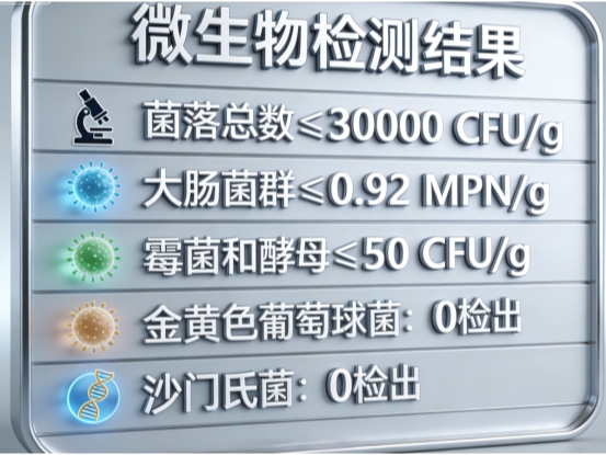 五号筛(80目)通过率95%,符合《中华人民共和国药典》标准,溶解快速无残留;卫生安全指标严苛,菌落总数≤30000 CFU/g、大肠菌群≤0.92 MPN/g、霉菌和酵母≤50 CFU/g,金黄色葡萄球菌和沙门氏菌均为0/25g,所有检测严格遵循GB 4789系列国家标准,保障产品纯净可靠。