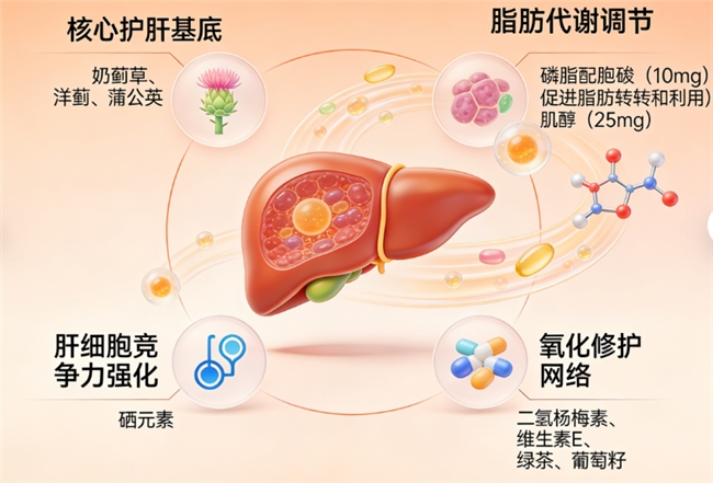 A:它主要是为我们补充一些有益于肝脏健康的特定营养素,比如水飞蓟素、奶蓟草提取物等,为肝脏细胞提供“后勤支援”,辅助其维持正常的代谢与解毒功能。可以把它理解为给肝脏这个“工厂”补充优质的“原料”和“维修工具”。