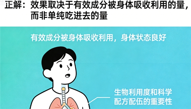 正解:效果取决于有效成分被身体吸收利用的量,而非单纯吃进去的量。过高的单次摄入量,身体无法吸收也是浪费,甚至可能增加代谢负担。因此,生物利用度(即吸收率)和科学的配方配伍,往往比单纯堆砌含量更重要。