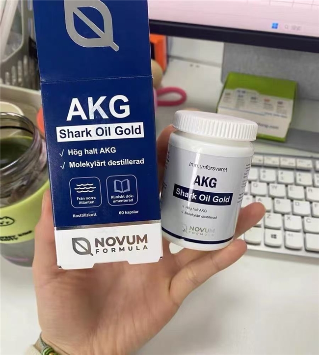 含AKG及鲨鱼肝油成分,外包装设计简约,适配中老年人、免疫力较弱人群。