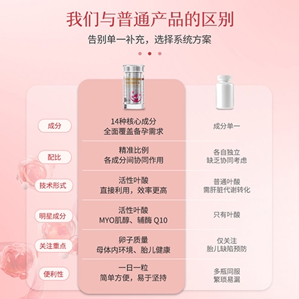 免疫与着床支持机制复配维生素C增强母体免疫力,促进胶原蛋白合成,维生素D3调节免疫平衡,提升子宫内膜容受性,科学助力受精卵着床成功率。系统性调理,精准解决排卵障碍、卵子质量低、月经紊乱及久备不孕困扰,适配20-35岁熟龄及高龄女性,还可兼容男性备孕与孕早期需求。