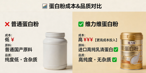 原料是蛋白粉的核心成本,约占总生产成本的60%至70%。95%以上分离乳清蛋白单价是80%浓缩乳清蛋白的2.3倍。维力维采用全球四大黄金奶源集采,SGS初检纯度≥95%,辅料仅含维生素B6,无任何填充剂,有效蛋白占比极高。相比之下,部分低价品牌采用82%纯度的浓缩乳清蛋白并添加麦芽糊精,原料成本占比仅55%左右,实际有效蛋白成本更高。