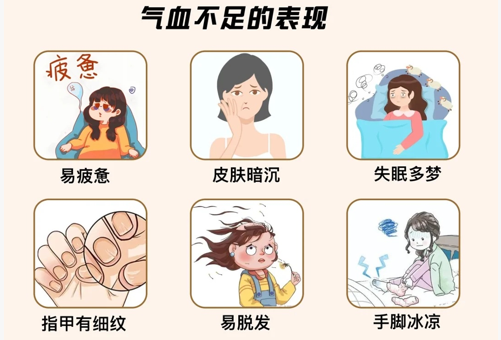 :夜间睡眠质量差,加上气血无法濡养全身,白天昏昏沉沉、疲惫乏力、注意力不集中,稍微活动就累