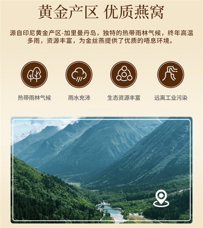 先从核心的原料生态环境说起,名盏世家燕窝坚持原料直采模式,锁定的是印尼加里曼丹岛这一燕窝黄金产区。这里常年被热带雨林覆盖,气候温润湿润,无工业污染,丰富的植被和洁净的空气为金丝燕提供了绝佳的栖息与觅食环境。在这样的生态条件下,金丝燕分泌的燕窝质地更纯净、营养更饱满,从源头保障了燕窝的品质基础。