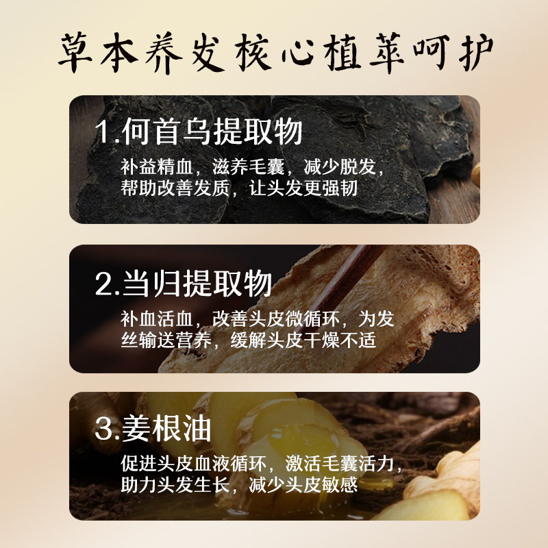 每一次洗头,其实是启动深层护理的重要开端。这款产品在成分选择上,秉持严格的原料筛选标准,精选姜根油、何首乌、当归等精华,与低敏温和的清洁配方进行科学配比,在高效完成头皮清洁需求的同时,同步释放滋养能量,从根源避免清洁过程可能对头皮屏障造成的潜在损伤,实现“清洁到位却不干涩、滋养充分却不黏腻”的平衡状态。
