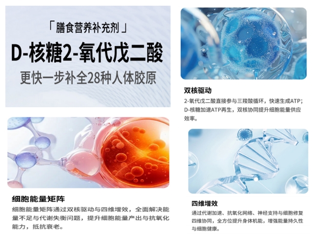 主打高纯度AKG协同D-核糖技术,通过四维配方布局细胞能量补给和系统抗氧化,激活多系统功能,支持运动恢复、抗老及美肤养颜,全链路保障细胞活力。